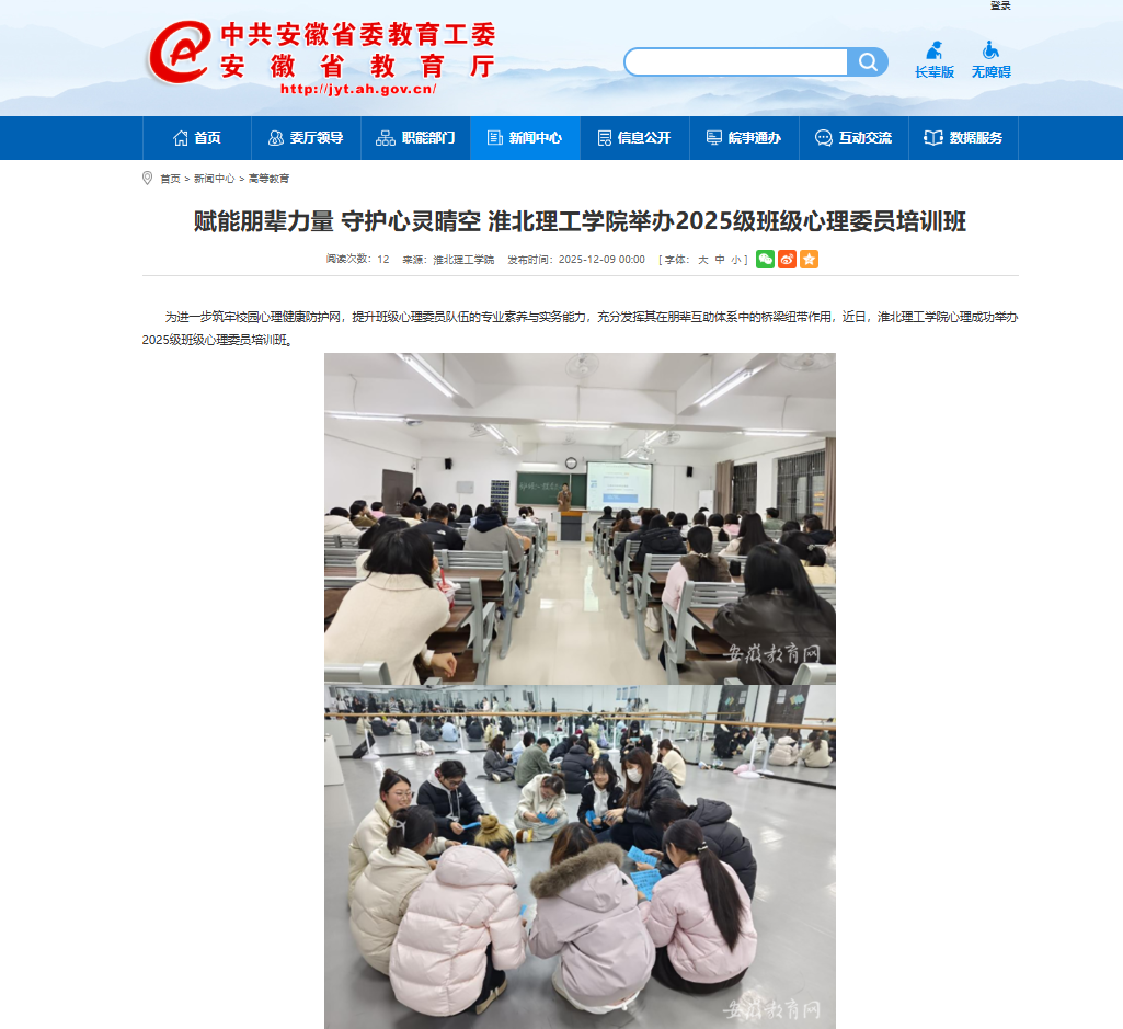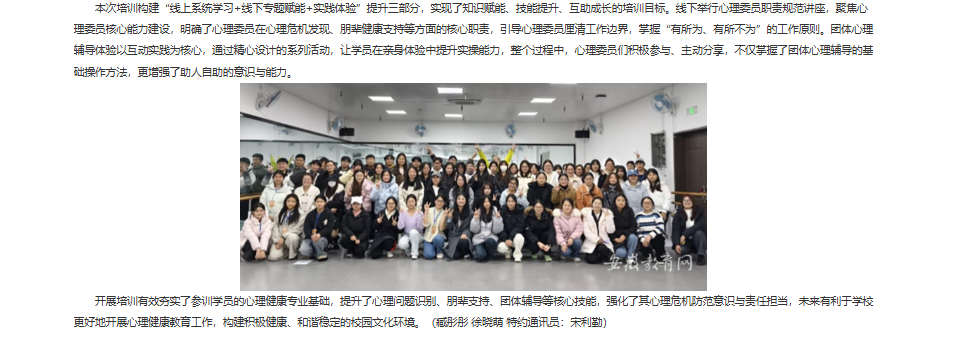 为进一步筑牢校园心理健康防护网,提升班级心理委员队伍的专业素养与实务能力,充分发挥其在朋辈互助体系中的桥梁纽带作用,近日,beat365唯一官方网站心理成功举办2025级班级心理委员培训班。对此,安徽教育网进行了报道: