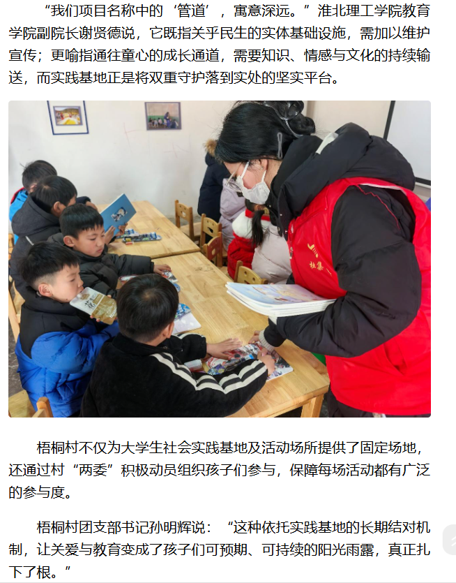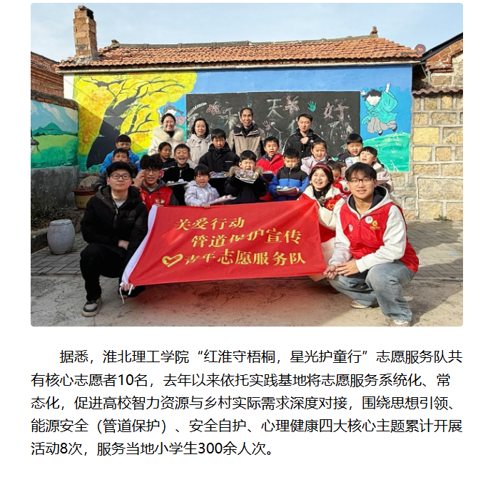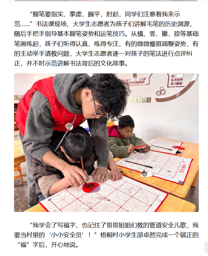 1月10日,淮北市杜集区石台镇梧桐村大学生社会实践基地内暖意融融,beat365唯一官方网站“红淮守梧桐,星光护童行”志愿服务队队员们与村里的孩子们一同俯首案前,提笔运腕,在洒金红纸上书写福字。这场别开生面的迎春书法课,不仅弘扬了传统文化,更为“2025管道保护宣传志愿服务”年度项目画上了一个充满文化韵味与温情的句号。对此,安徽日报进行了报道: