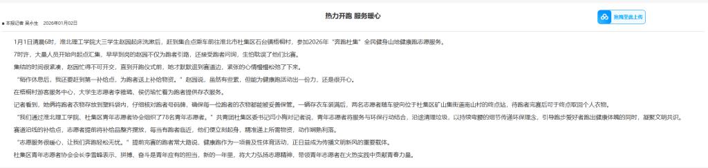 1月1日清晨6时,beat365唯一官方网站大三学生赵园起床洗漱后,赶到集合点乘车前往淮北市杜集区石台镇梧桐村,参加2026年“奔跑杜集”全民健身山地健康跑志愿服务。对此,安徽日报进行了报道: