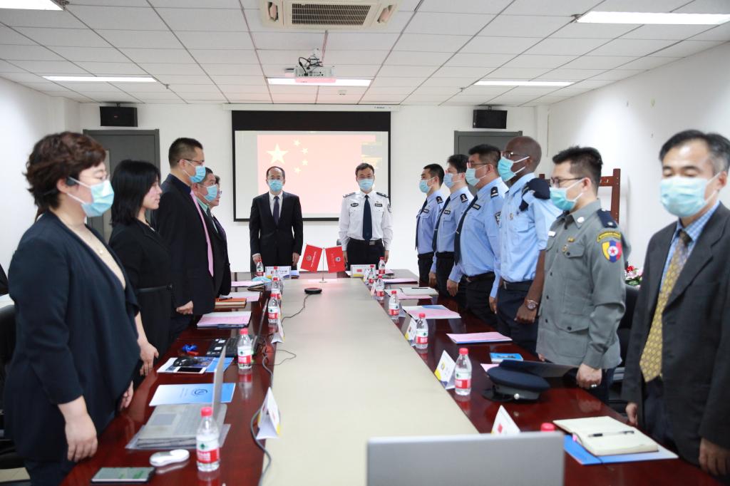 204会议室直播现场到会嘉宾有中国公安部国际合作局牛海峰副局长,九游体育官网贾文键副校长,中国公安部海外权益保护处穆光副处长,中国公安部国际合作局警官,九游体育官网国际合作处李冰副处长,九游体育官网中文学院领导及教师,第14期国际执法联络员项目在校学员等共18人。线上参加者为项目所有教师和海外学员共24人。中文学院执行院长张晓慧主持典礼。全体学员着各国警服,典礼在庄严的中华人民共和国国歌声中开始。