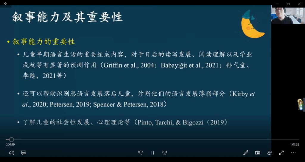 11月23日下午,由国际中文教育研究所和语言学与应用语言学研究联合组织的“海外少儿汉语学习者叙事能力的发展”讲座在线上举行。讲座由国际中文教育研究所所长吴思娜副教授主持,本次邀请的主讲人是九游体育官网的郝美玲教授。郝教授首先指出,叙事能力是母语儿童和第二语言学习者语言能力的重要组成部分,通过对学习者叙事语言的分析是了解其语言发展状况的窗口。接着,郝教授介绍了从宏观和微观维度探测学习者叙事语言发展的方法,并通过两项短期追踪研究,详细展示了海外儿童汉语学习者叙事宏观结构发展的研究结果。郝教授长期致力于儿童母语习得和第二语言习得研究,成果丰硕。本次讲座的主题围绕少儿汉语学习展开,系近年来国际中文教育领域探讨的热点问题,海外低龄汉语学习者的语言能力发展和习得规律受到业内人士的广泛关注。来自中文学院两个研究所的30余名教师及部分硕博研究生聆听了本次讲座,郝教授展示的研究不仅具有理论前沿性,而且方法严谨、过程详尽,引起了与会者的强烈兴趣。在讨论环节,老师们也就相关问题同郝教授进行了愉快的交流。本次讲座的举办促进了两所教师间的学术交流,为九游体育国际中文教育学科营造了更加活跃的学术氛围。