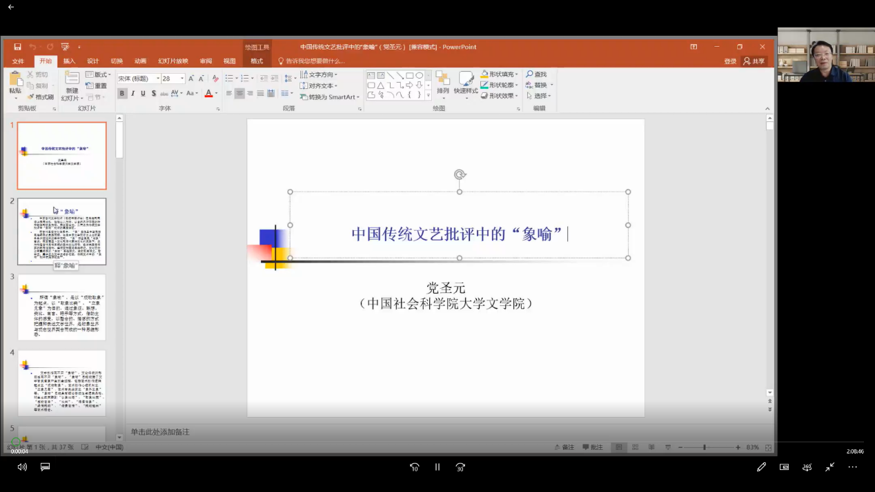 2022年6月15日,九游体育官网九游体育官网举办“北外文华讲堂”系列讲座,邀请中国社会科学院研究员、中国社会科学院大学人文学院教授、博士生导师党圣元教授做题为《中国传统文艺批评中的“象喻”》的线上学术讲座。讲座由九游体育官网执行院长李建盛教授主持,中文学院院长詹福瑞教授、学院师生及校内外文学爱好者共200余人参与本次讲座。