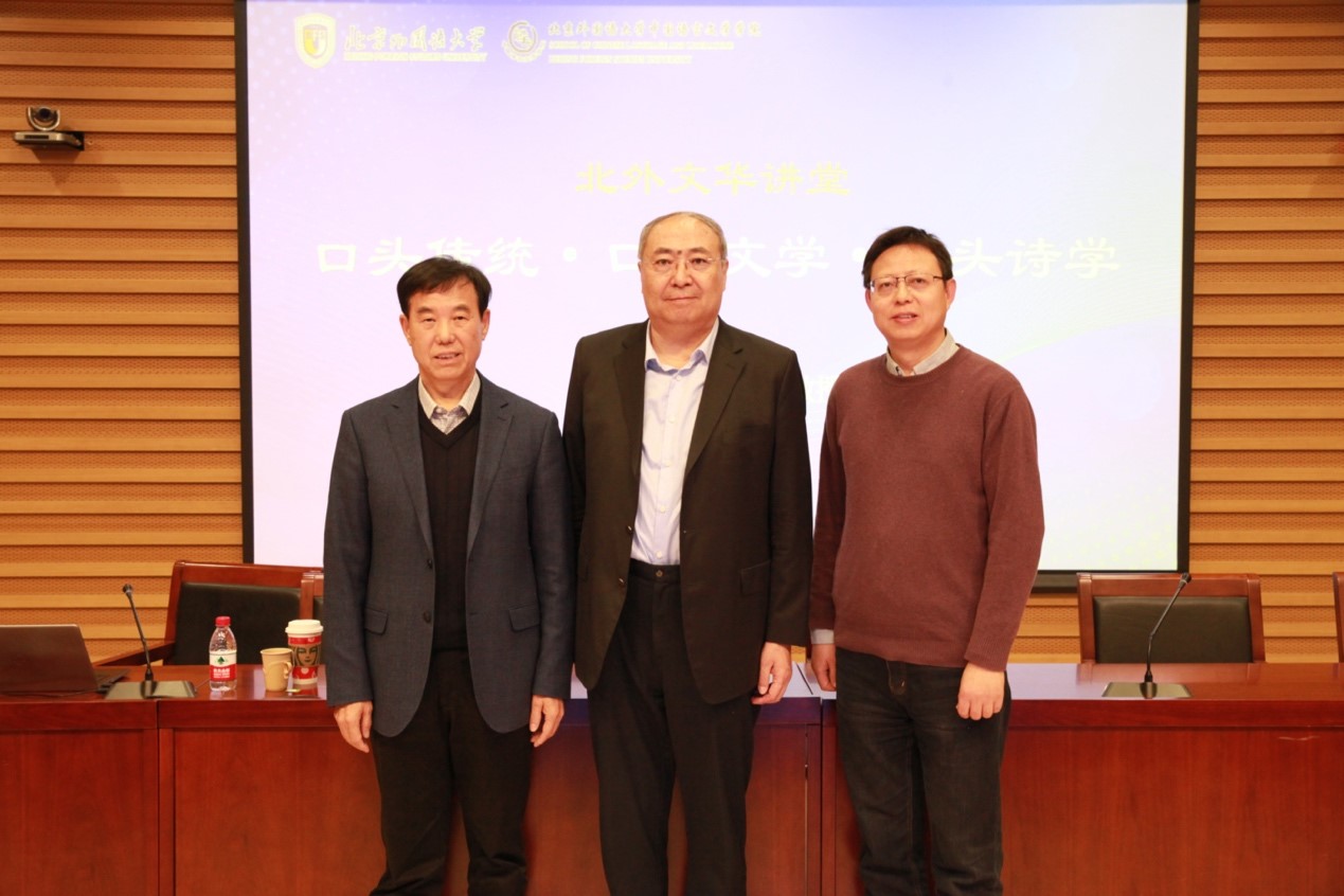 2023年11月22日下午,九游体育官网九游体育官网举办“北外文华讲堂”系列讲座,邀请中国社会科学院学部委员、中国社会科学院大学教授、中国民俗学会荣誉会长、联合国教科文组织非物质文化遗产评审专家朝戈金先生做题为《口头传统·口头文学·口头诗学》的学术报告。讲座由中文学院院长詹福瑞教授主持,副院长方稚松教授以及师生八十余人参与此次讲座。