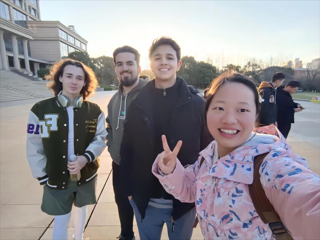 张甜桃同学积极参加学校组织的政治学习活动,作为一名入党积极分子参加学校“青马工程”培训班,深入学习宣传贯彻习近平新时代中国特色社会主义思想,积极提高自身政治站位和自我修养。在校期间勤奋好学、刻苦努力,综合素质测评一直位列班级第一。在学习之余,她寒假参观各大高校并激励自己,为自己定下考研目标和方向(下图是张甜桃去复旦大学与留学生的合影留恋,当时的她鼓起勇气,用英文与留学生对话来挑战自己)。