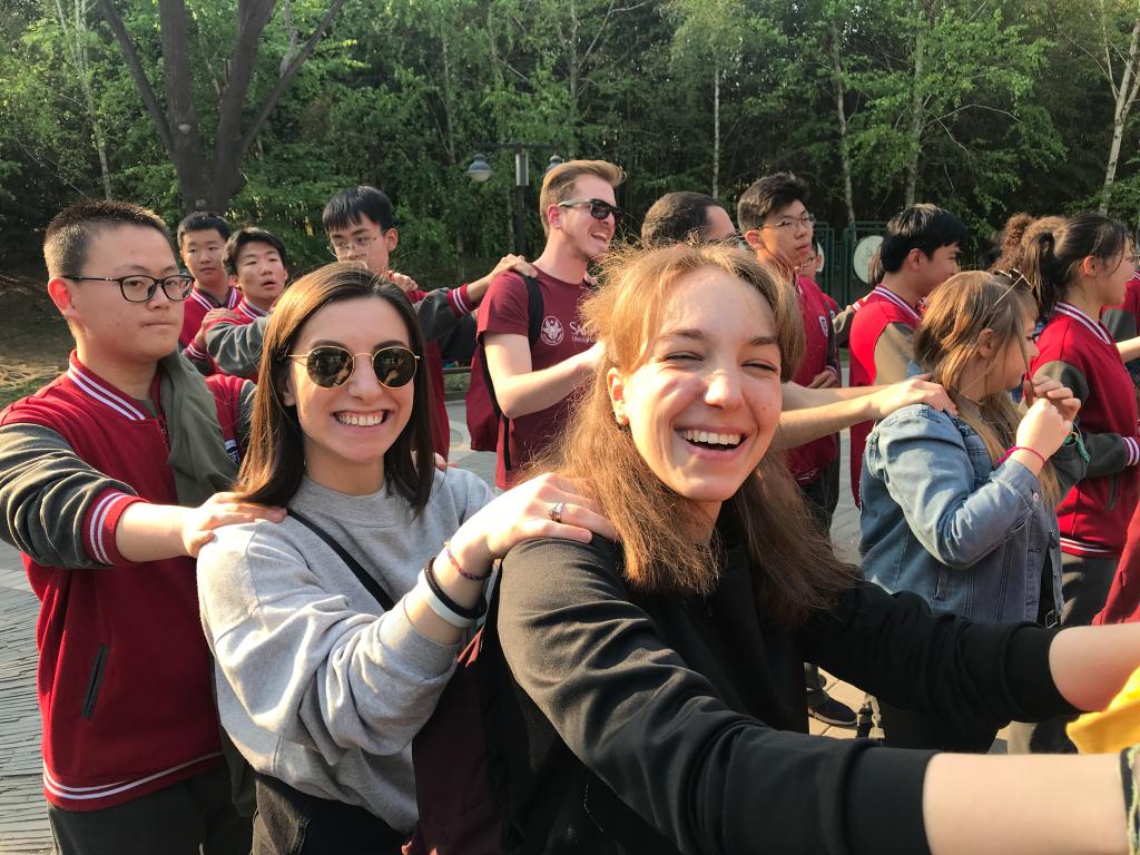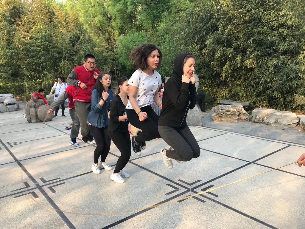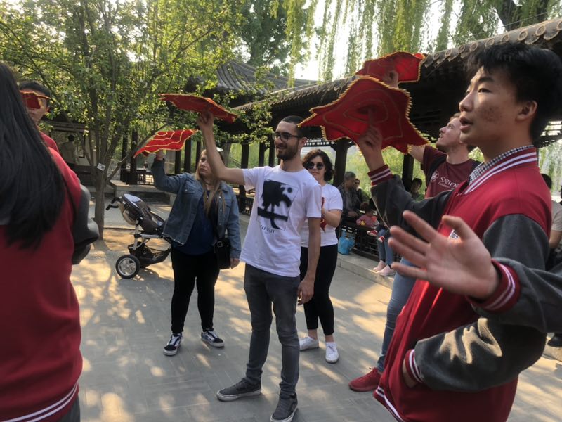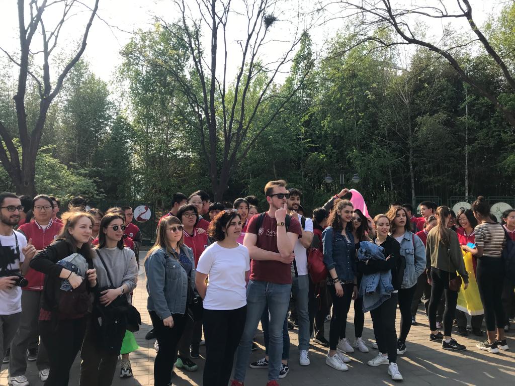 2019年4月15日星期一下午,九游体育官网中文学院对外汉语系2018级意大利罗马班的全体留学生与北外附中初三、高一年级学生共同参加了在紫竹院公园举办的“青春飞扬,舞动春日” “1+3”年级趣味运动会。