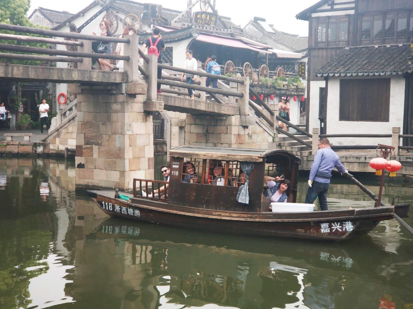 在素有“东方威尼斯”之称的水乡西塘,学生们在烟雨长廊间游走,一边欣赏花红柳绿、白墙黑瓦的美景,一边拍照、合影,有的坐船游河,有的与当地人交流、购买纪念品,有的品尝美食,有的体验鱼疗等等。
