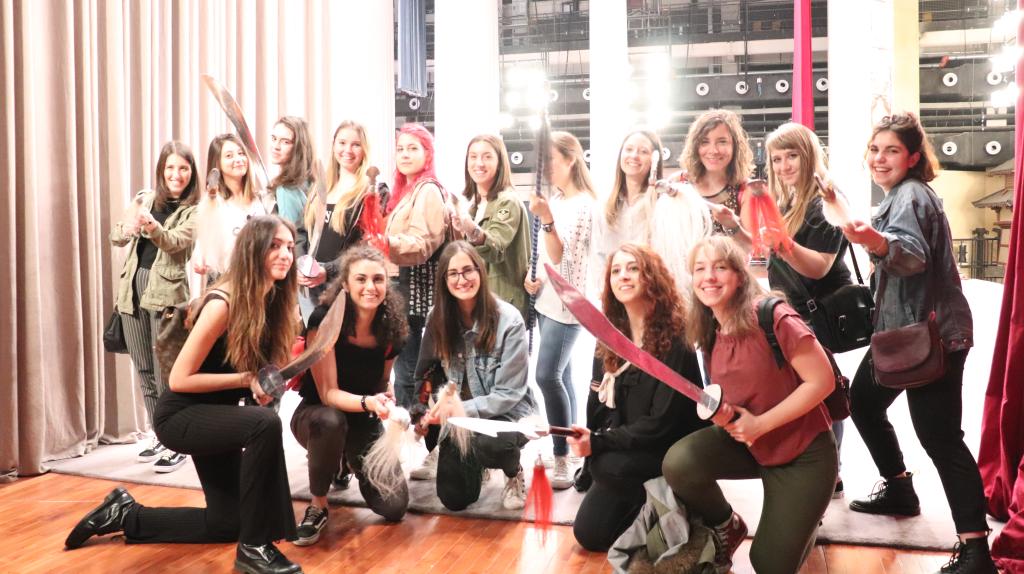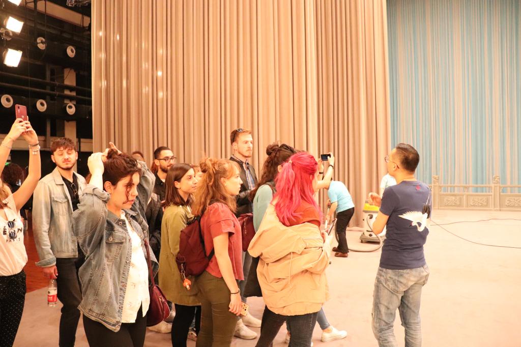 5月19日在九游体育官网中文学院对外汉语系就读的22名意大利罗马大学留学生在夏菁老师的带领下来到人民剧场,观看了中国国家京剧院名家京剧《红桃山》的录制。