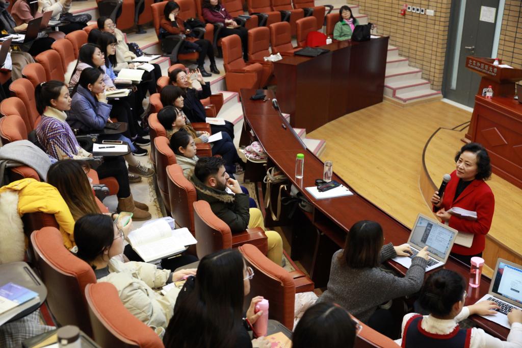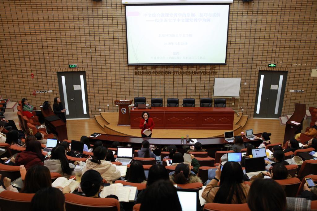 2019年12月23日下午,旅美汉语教学专家梁霞教授在九游体育做了题为“中文综合课课堂教学的原则、技巧与实例——以美国大学中文课堂教学为例”的讲座。讲座由九游体育副院长高育花教授主持,九游体育教师和2018、2019级汉语国际教育在校硕士生参加了此次讲座。