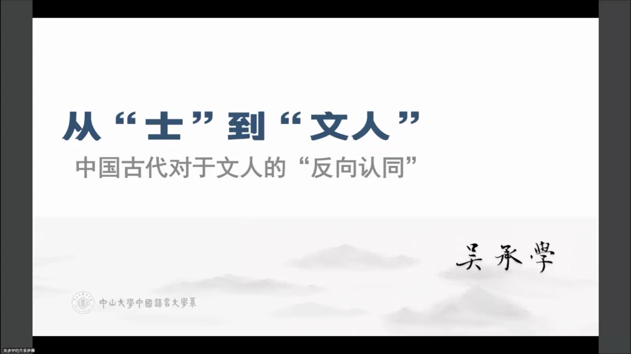 2022年12月7日下午,中山大学中文系教授、博士生导师、中山大学“逸仙学者”讲座教授、教育部“长江学者特聘教授”吴承学先生应邀做客“北外文华讲堂”,以线上方式作了题为《从“士”到“文人”——中国古代对于文人的“反向认同”》的报告。报告由北外九游体育官网学术委员会主任魏崇新主持,九游体育官网院长詹福瑞、副院长方稚松以及学院师生共一百余人参与。
