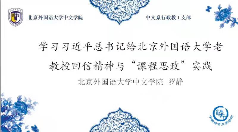 罗老师首先与大家一起重温了习近平总书记给北外老教授回信的主要内容,重点谈到了自己对回信的理解与感受。她对回信当中所提到的“北外老教授的传、帮、带”深有体会——她受益于老教授们教学科研的启迪、党务工作的引领以及语音纠音的帮扶等等。这些对青年教师的成长都至关重要。