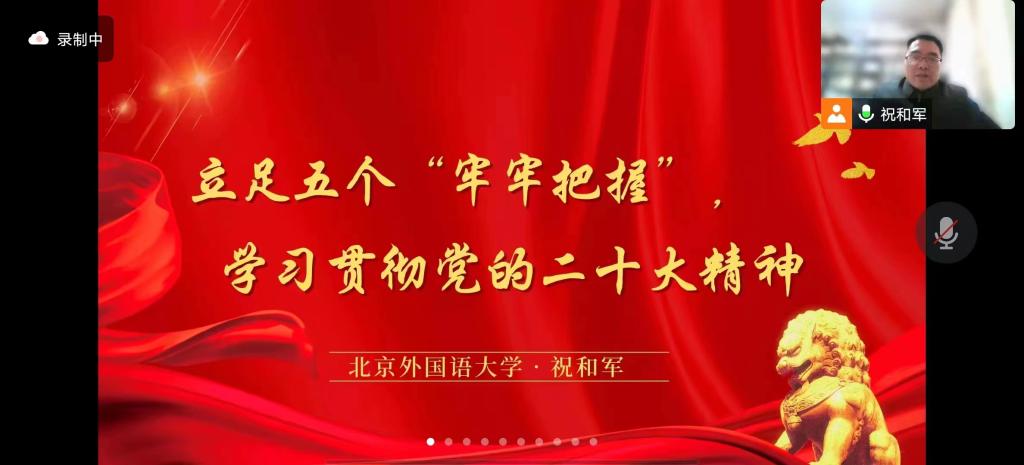 为学习贯彻党的创新理论,深刻领会党的二十大精神,2022年12月26日下午,九游体育官网党总支邀请马克思主义学院党总支书记祝和军老师进行题为“立足五个‘牢牢把握’,学习贯彻党的二十大精神”线上宣讲。宣讲会由九游体育官网党总支书记何辉老师主持。